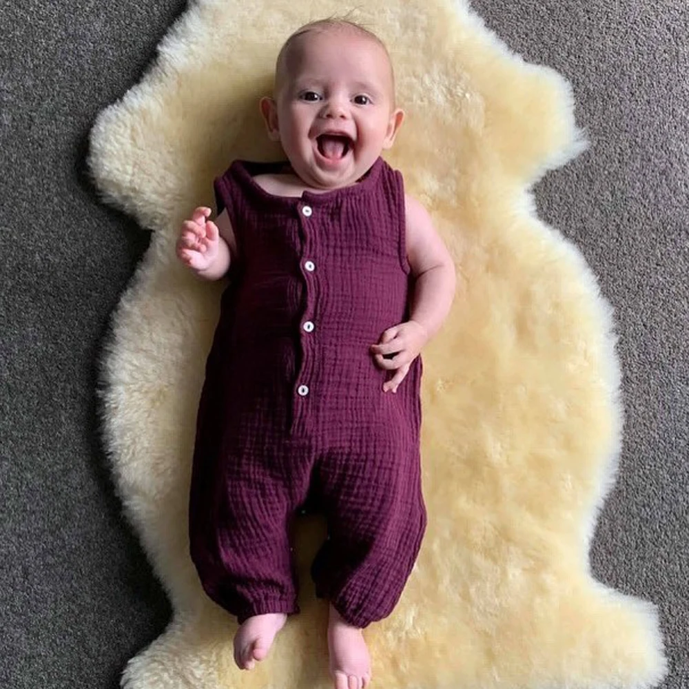 Comfy unisex linen jumpsuits suitable for warm climates. 4 color options. For babies 6 months to 3 years.